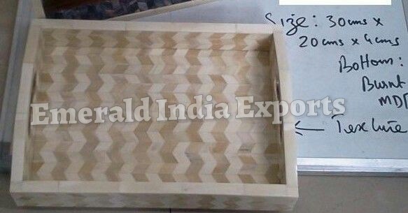 This tray is made in Bone and burn MDF.The tray has a unique  pattern design.The different sizes of bond are  cut and pasted on MDF board.The standard size of tray is 30cms x20cms x4 cms but it is available in all sizes as per demand.
